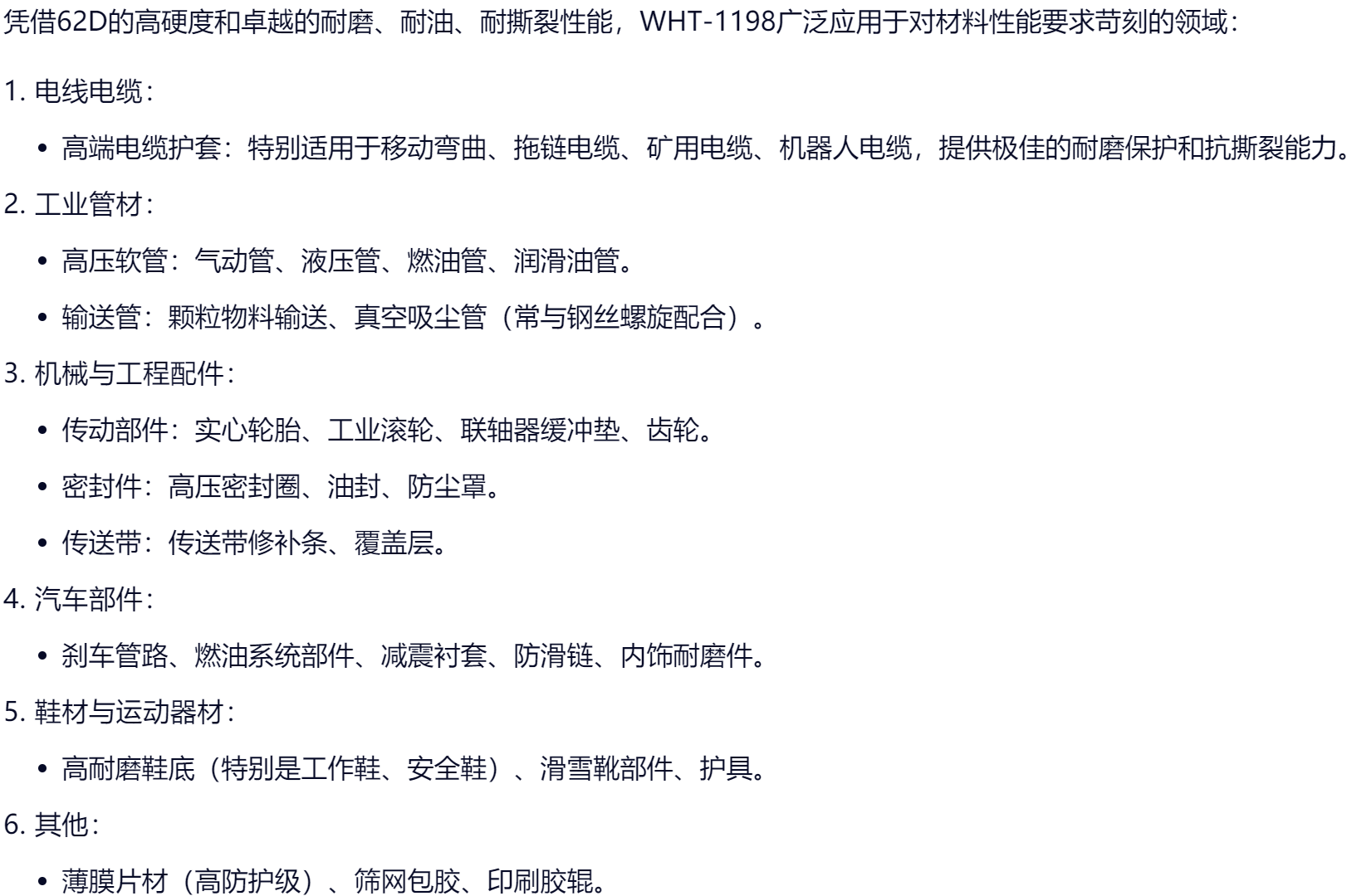 主要特性:超高硬度(约62D/97A)、高强度、高耐磨、耐撕裂、耐油、耐低温、透明/半透明。